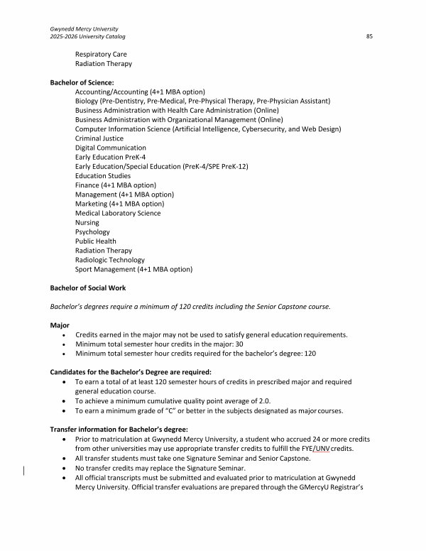 Gwynedd Mercy University 2025-2026 University Catalog 85