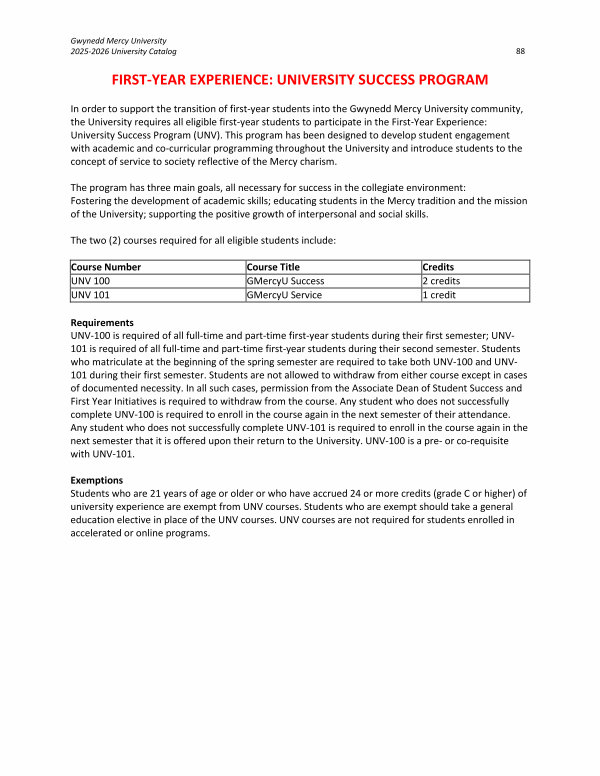 In order to support the transition of first-year students into the Gwynedd Mercy University community, the University requires all eligible first-year students to participate in the First-Year Experience: University Success Program( UNV). This program has been designed to develop student engagement with academic and co-curricular programming throughout the University and introduce students to the concept of service to society reflective of the Mercy charism.