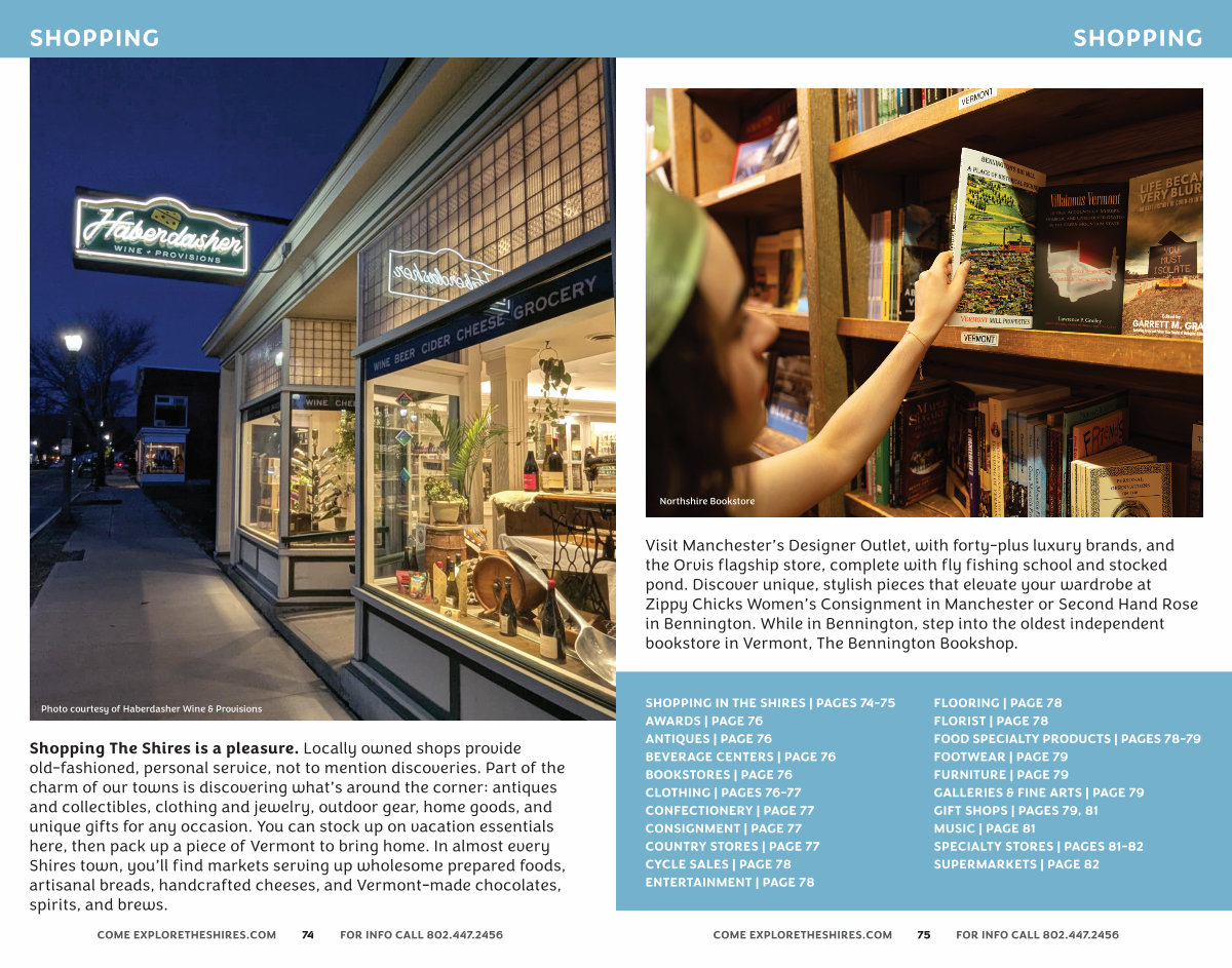 Shopping The Shires is a pleasure. Locally owned shops provide old-fashioned, personal service, not to mention discoveries. Part of the charm of our towns is discovering what’ s around the corner: antiques and collectibles, clothing and jewelry, outdoor gear, home goods, and unique gifts for any occasion. You can stock up on vacation essentials here, then pack up a piece of Vermont to bring home. In almost every Shires town, you’ ll find markets serving up wholesome prepared foods, artisanal breads, handcrafted cheeses, and Vermont-made chocolates, spirits, and brews.