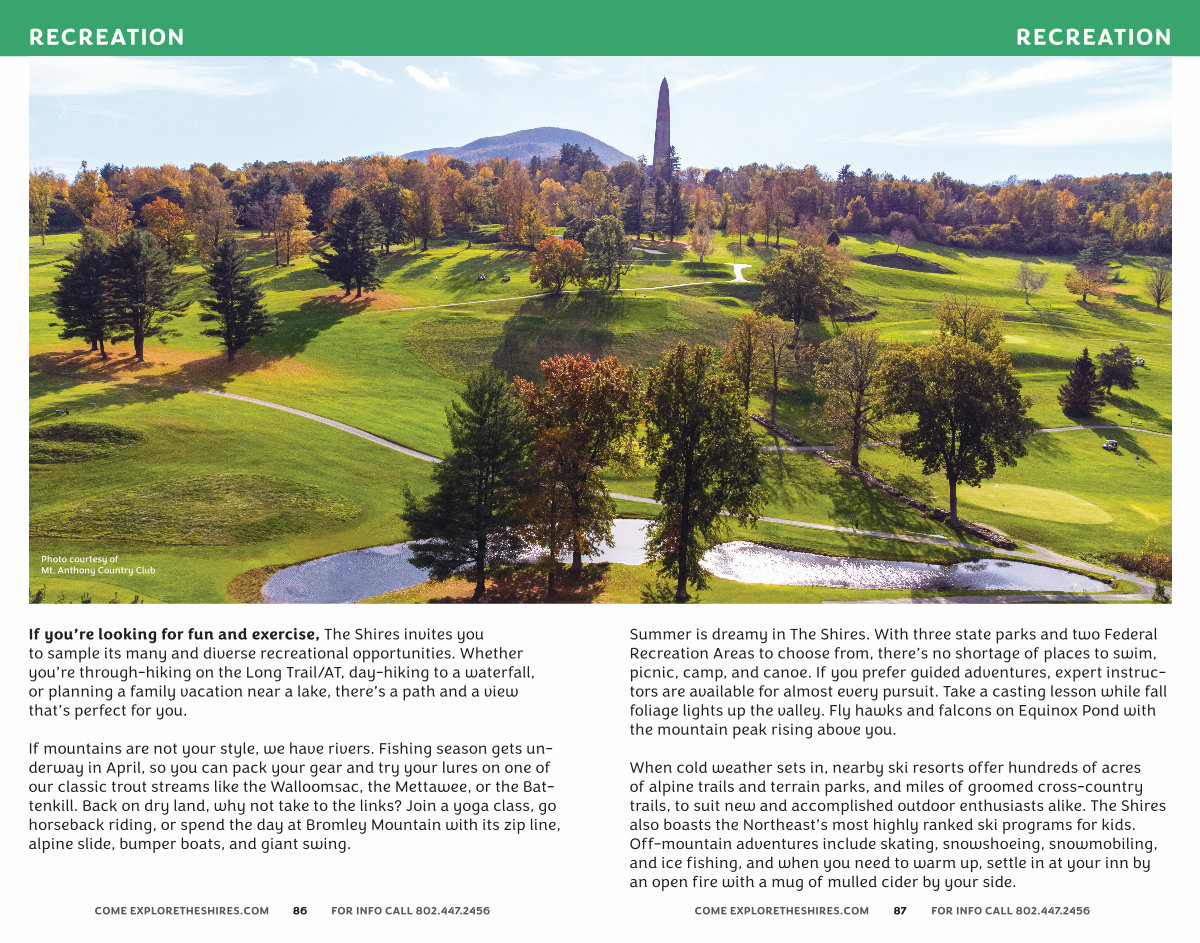 Summer is dreamy in The Shires. With three state parks and two Federal Recreation Areas to choose from, there’ s no shortage of places to swim, picnic, camp, and canoe. If you prefer guided adventures, expert instructors are available for almost every pursuit. Take a casting lesson while fall foliage lights up the valley. Fly hawks and falcons on Equinox Pond with the mountain peak rising above you.