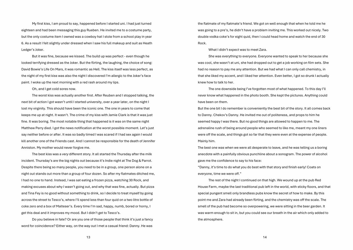 But it was fine, because we kissed. The build up was perfect- even though he looked terrifying dressed as the Joker. But the flirting, the laughing, the choice of song: David Bowie’ s Life On Mars, it was romantic as Hell. The kiss itself was less perfect, as the night of my first kiss was also the night I discovered I’ m allergic to the Joker’ s face paint. I woke up the next morning with a red rash around my lips. Oh, and I get cold sores now. The worst kiss was actually another first. After Reuben and I stopped talking, the next bit of action I got wasn’ t until I started university, over a year later, on the night I lost my virginity. This should have been the iconic one. The one in years to come that keeps me up at night. It wasn’ t. The crime of my kiss with Jamie Clark is that it was just fine. It was boring. The most notable thing that happened is it was on the same night Matthew Perry died. I got the news notification at the worst possible moment. Let’ s just say neither before or after. It was so badly timed I was scared if I had sex again I would kill another one of the Friends cast. And I cannot be responsible for the death of Jennifer Anniston. My mother would never forgive me.