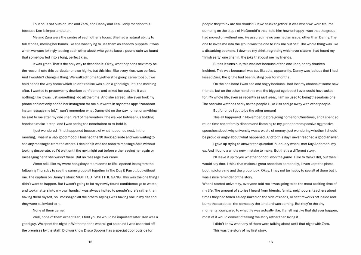 I’ ll leave it up to you whether or not I won the game. I like to think I did, but then I would say that. I think that makes a great anecdote personally, I even kept the photo booth picture me and the group took. Okay, I may not be happy to see all of them but it was a nice reminder of the story. When I started university, everyone told me it was going to be the most exciting time of my life. The amount of stories I heard from friends, family, neighbours, teachers about times they had fallen asleep naked on the side of roads, or set fireworks off inside and burnt the carpet on the same day the landlord was coming. But they’ re the tiny moments, compared to what life was actually like. If anything like that did ever happen, most of it would consist of telling the story rather than living it. I didn’ t know what any of them were talking about until that night with Zara. This was the story of my first story.