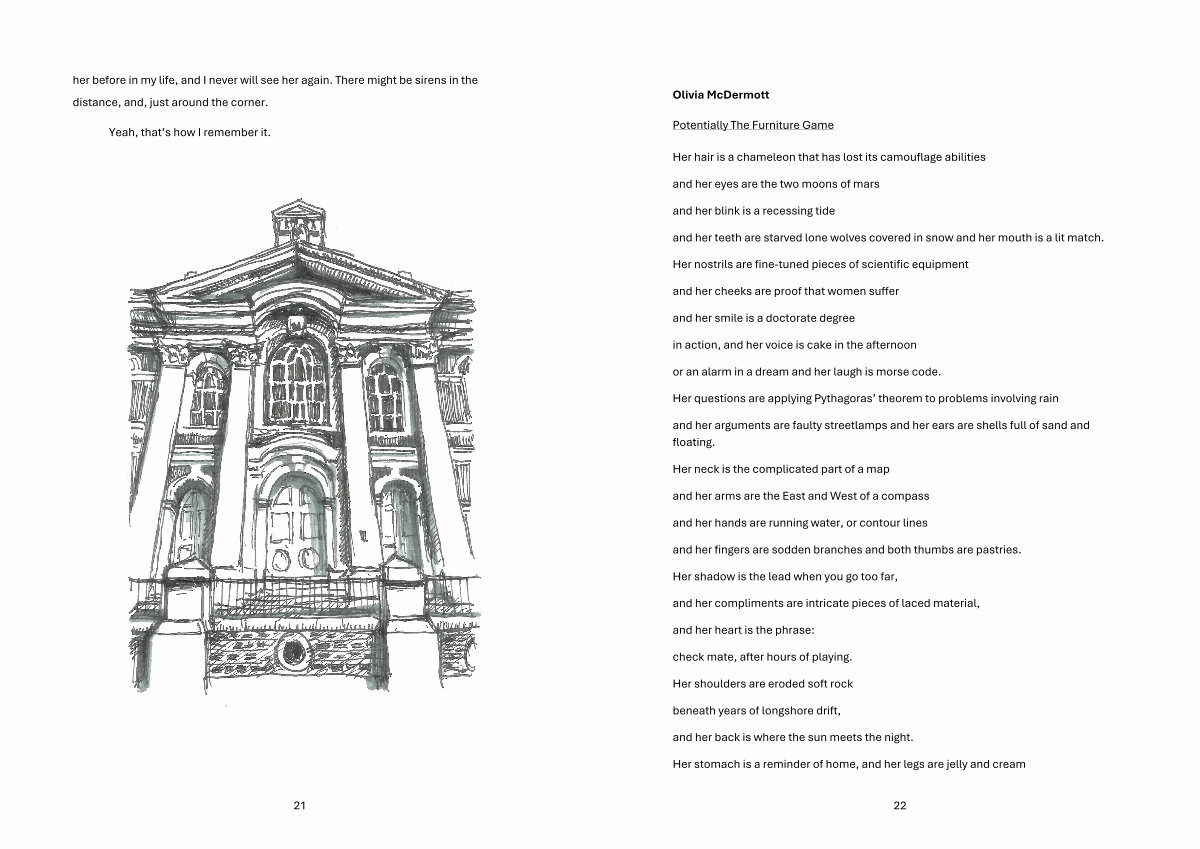 Her neck is the complicated part of a map and her arms are the East and West of a compass and her hands are running water, or contour lines and her fingers are sodden branches and both thumbs are pastries. Her shadow is the lead when you go too far, and her compliments are intricate pieces of laced material, and her heart is the phrase: check mate, after hours of playing. Her shoulders are eroded soft rock beneath years of longshore drift, and her back is where the sun meets the night. Her stomach is a reminder of home, and her legs are jelly and cream