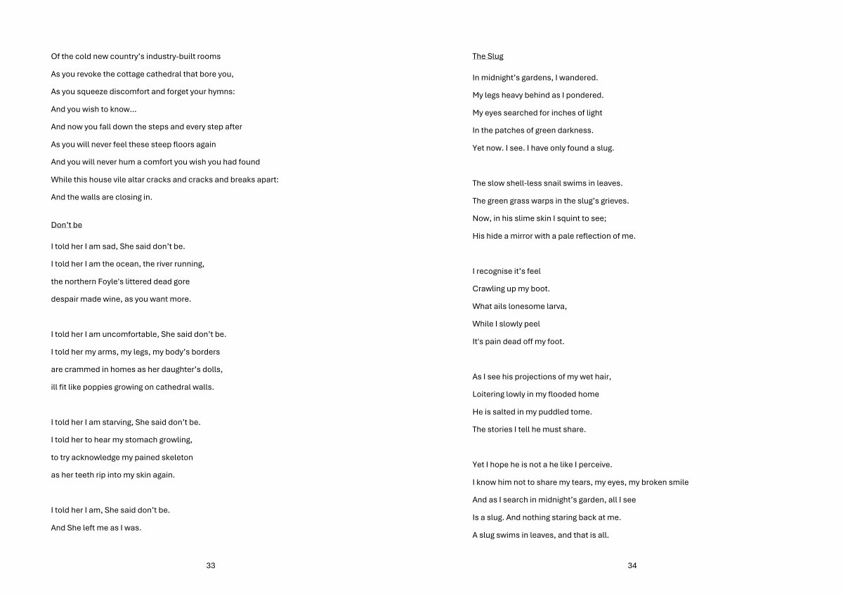 The slow shell-less snail swims in leaves. The green grass warps in the slug’ s grieves. Now, in his slime skin I squint to see; His hide a mirror with a pale reflection of me.