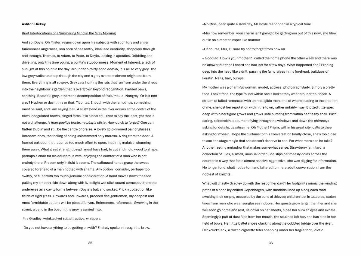 And so, Doyle, Oh Mister, reigns down upon his subjects with such fury and anger, furiousness angerness, son born of peasantry, idealised centricity, shopclerk through and through. Thomas, to Adam, to Peter, to Doyle, lacking in apostles. Dribbling and drivelling, only this time young, a gorilla’ s stubbornness. Moment of Interest: a lack of sunlight at this point in the day, around ten-thirty anno domini, it is all so very grey. The low grey walls run deep through the city and a grey overcast almost originates from them. Everything is all so grey. Grey cats hunting the rats that run from under the sheds into the neighbour’ s garden that is overgrown beyond recognition. Padded paws, scrithing. Beautiful grey, others the decomposition of fruit. Mould. Nongrey. Or is it nongrey? Hyphen or dash, this or that. Tit or tat. Enough with the ramblings, something must be said, and I am saying it all. A slight bend in the river occurs at the centre of the town, coagulated brown, singed ferns. It is a beautiful river to say the least, yet that is not a challenge. Is fearr gaeilge briste, na béarla cliste. How quick to forget? One can flatten Dublin and still be the centre of praise. A lovely gold-rimmed pair of glasses. Boredom-dom, the feeling of being uninterested only moreso. A ring from the door. A framed oak door that requires too much effort to open, inspiring malaise, shunning them away. What great strength Joseph must have had, to cut and mold wood to shape, perhaps a chair for his adulterous wife, enjoying the comfort of a man who is not entirely there. Present only in fluid it seems. The calloused hands grasp the sweat covered forehead of a man riddled with shame. Any option I consider, perhaps too swiftly, or filled with too much genuine consideration. A hand moves down the face pulling my smooth skin down along with it, a slight wet click sound comes out from the undereyes as a cavity forms between Doyle’ s ball and socket. Prickly collection like fields of rigid grass. Onwards and upwards, proceed fine gentlemen, my deepest and most formidable actions will be placed for you. References, references. Swerving in the street, a bend in the bosom, the grey is carried into.