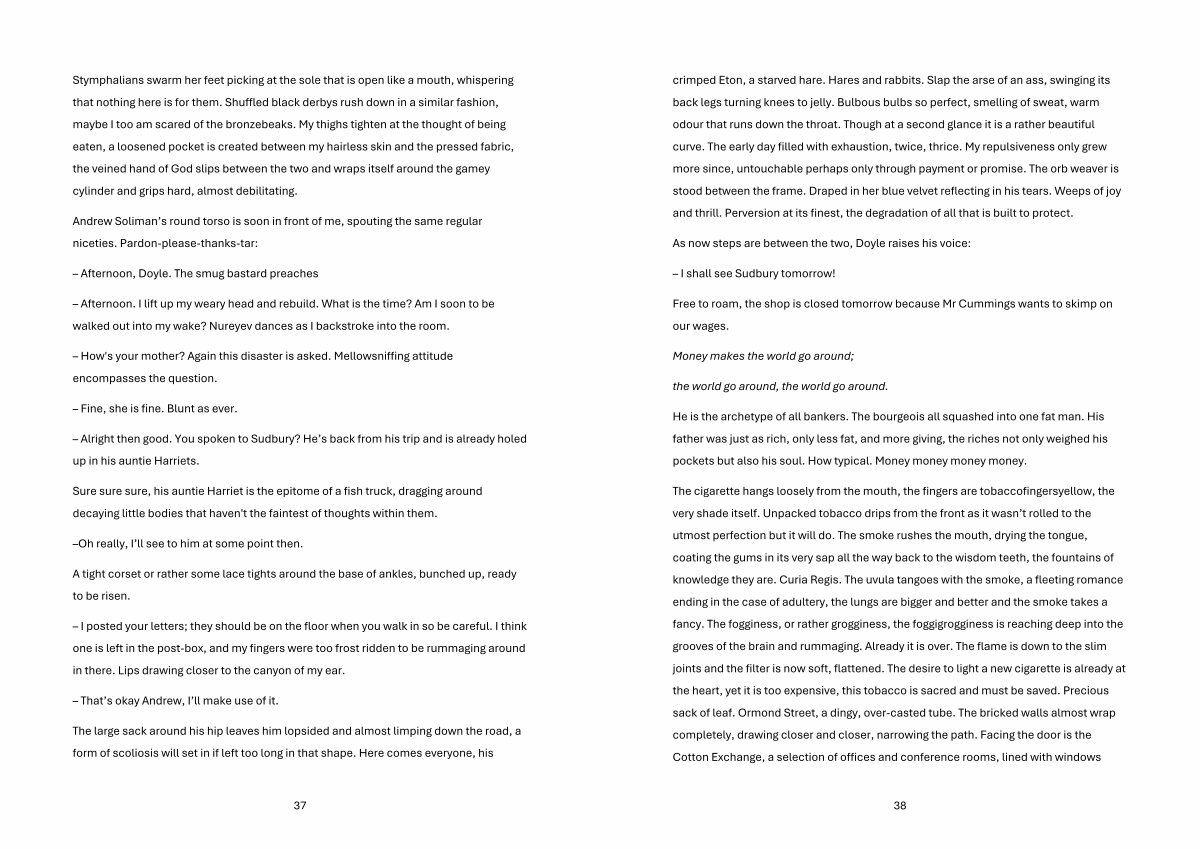 The cigarette hangs loosely from the mouth, the fingers are tobaccofingersyellow, the very shade itself. Unpacked tobacco drips from the front as it wasn’ t rolled to the utmost perfection but it will do. The smoke rushes the mouth, drying the tongue, coating the gums in its very sap all the way back to the wisdom teeth, the fountains of knowledge they are. Curia Regis. The uvula tangoes with the smoke, a fleeting romance ending in the case of adultery, the lungs are bigger and better and the smoke takes a fancy. The fogginess, or rather grogginess, the foggigrogginess is reaching deep into the grooves of the brain and rummaging. Already it is over. The flame is down to the slim joints and the filter is now soft, flattened. The desire to light a new cigarette is already at the heart, yet it is too expensive, this tobacco is sacred and must be saved. Precious sack of leaf. Ormond Street, a dingy, over-casted tube. The bricked walls almost wrap completely, drawing closer and closer, narrowing the path. Facing the door is the Cotton Exchange, a selection of offices and conference rooms, lined with windows