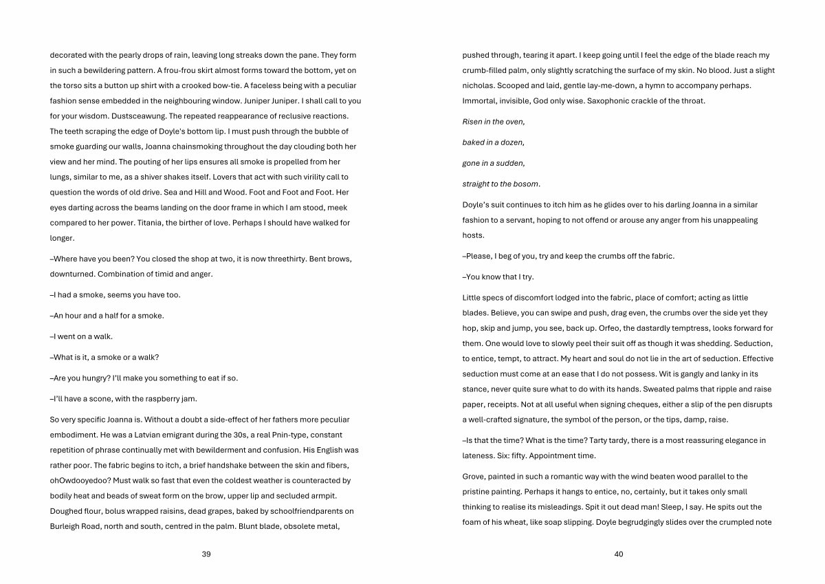 decorated with the pearly drops of rain, leaving long streaks down the pane. They form in such a bewildering pattern. A frou-frou skirt almost forms toward the bottom, yet on the torso sits a button up shirt with a crooked bow-tie. A faceless being with a peculiar fashion sense embedded in the neighbouring window. Juniper Juniper. I shall call to you for your wisdom. Dustsceawung. The repeated reappearance of reclusive reactions. The teeth scraping the edge of Doyle ' s bottom lip. I must push through the bubble of smoke guarding our walls, Joanna chainsmoking throughout the day clouding both her view and her mind. The pouting of her lips ensures all smoke is propelled from her lungs, similar to me, as a shiver shakes itself. Lovers that act with such virility call to question the words of old drive. Sea and Hill and Wood. Foot and Foot and Foot. Her eyes darting across the beams landing on the door frame in which I am stood, meek compared to her power. Titania, the birther of love. Perhaps I should have walked for longer.