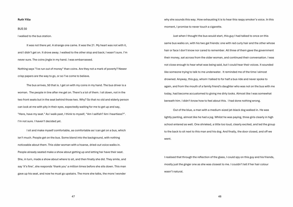I sit and make myself comfortable, as comfortable as I can get on a bus, which isn’ t much. People get on the bus. Some blend into the background, with nothing noticeable about them. This older woman with a hoarse, dried-out voice walks in. People already seated make a show about getting up and letting her have their seat. She, in turn, made a show about where to sit, and then finally she did. They smile, and say‘ it’ s fine’, she responds‘ thank you’ a million times before she sits down. This man gave up his seat, and now he must go upstairs. The more she talks, the more I wonder