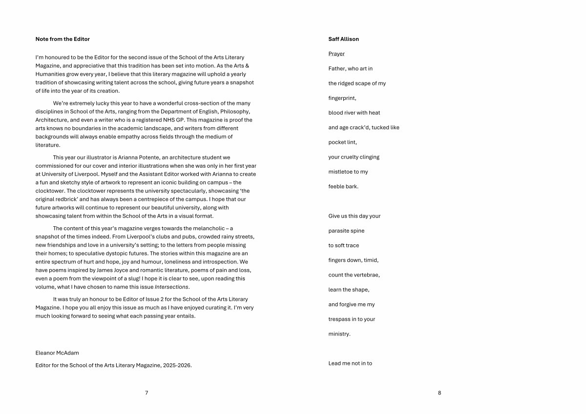The content of this year’ s magazine verges towards the melancholic – a snapshot of the times indeed. From Liverpool’ s clubs and pubs, crowded rainy streets, new friendships and love in a university’ s setting; to the letters from people missing their homes; to speculative dystopic futures. The stories within this magazine are an entire spectrum of hurt and hope, joy and humour, loneliness and introspection. We have poems inspired by James Joyce and romantic literature, poems of pain and loss, even a poem from the viewpoint of a slug! I hope it is clear to see, upon reading this volume, what I have chosen to name this issue Intersections.