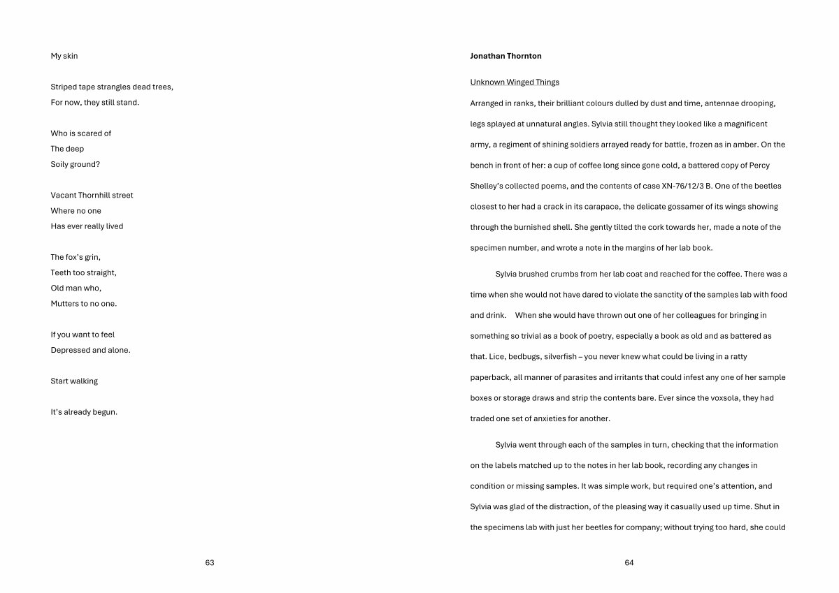 When she would have thrown out one of her colleagues for bringing in something so trivial as a book of poetry, especially a book as old and as battered as that. Lice, bedbugs, silverfish – you never knew what could be living in a ratty paperback, all manner of parasites and irritants that could infest any one of her sample boxes or storage draws and strip the contents bare. Ever since the voxsola, they had traded one set of anxieties for another.