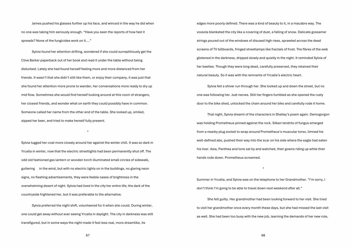Sylvia tugged her coat more closely around her against the winter chill. It was so dark in Yrcalla in winter, now that the electric streetlights had been permanently shut off. The odd old fashioned gas lantern or wooden torch illuminated small circles of sidewalk, guttering in the wind, but with no electric lights on in the buildings, no glaring neon signs, no flashing advertisements, they were feeble oases of brightness in the overwhelming desert of night. Sylvia had lived in the city her entire life; the dark of the countryside frightened her, but it was preferable to the alternative.