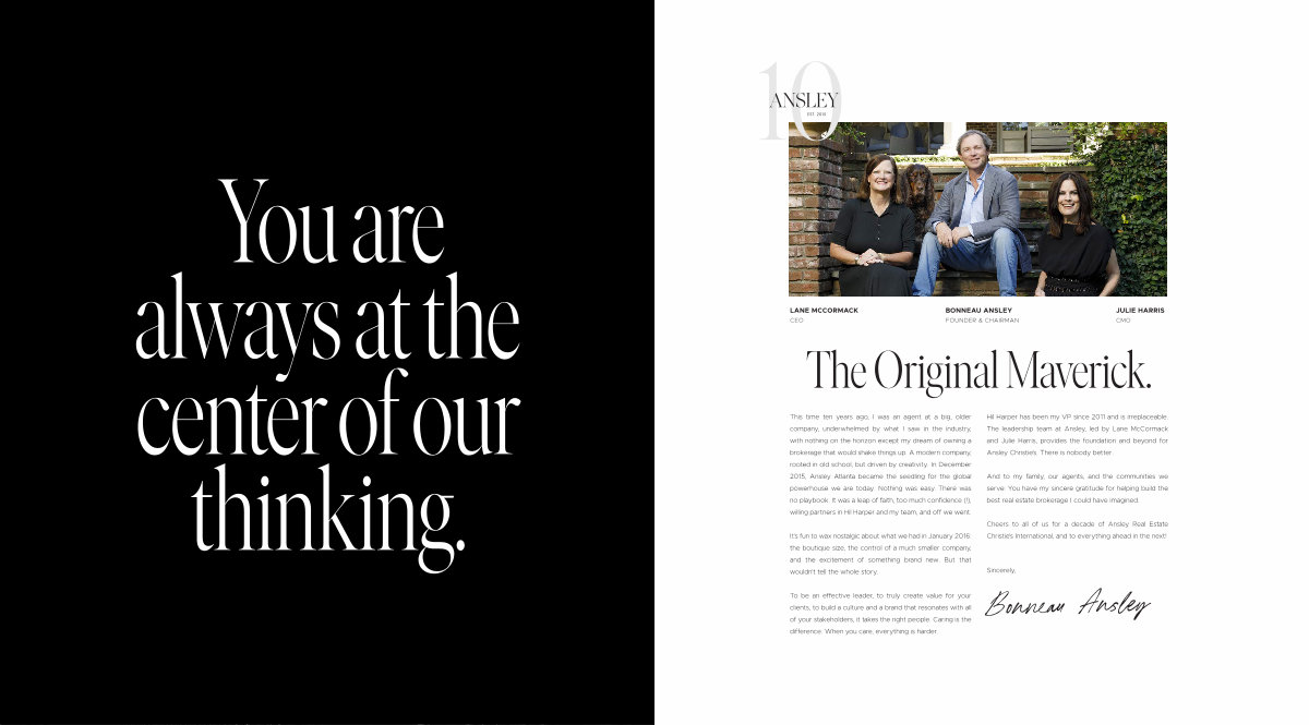 This time ten years ago, I was an agent at a big, older company, underwhelmed by what I saw in the industry, with nothing on the horizon except my dream of owning a brokerage that would shake things up. A modern company, rooted in old school, but driven by creativity. In December 2015, Ansley Atlanta became the seedling for the global powerhouse we are today. Nothing was easy. There was no playbook. It was a leap of faith, too much confidence(!), willing partners in Hil Harper and my team, and off we went.