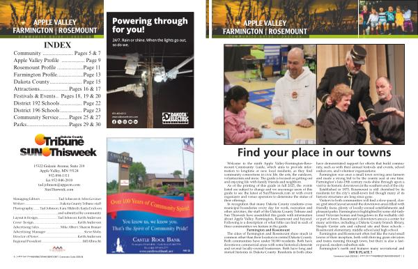 In recognition that many Dakota County residents cross municipal boundaries every day for work, recreation and other activities, the staff of the Dakota County Tribune and Sun Thisweek have assembled this guide with information about Apple Valley, Farmington, Rosemount and beyond. Following is a description of what folks can find in each of three communities we feature in the guide.