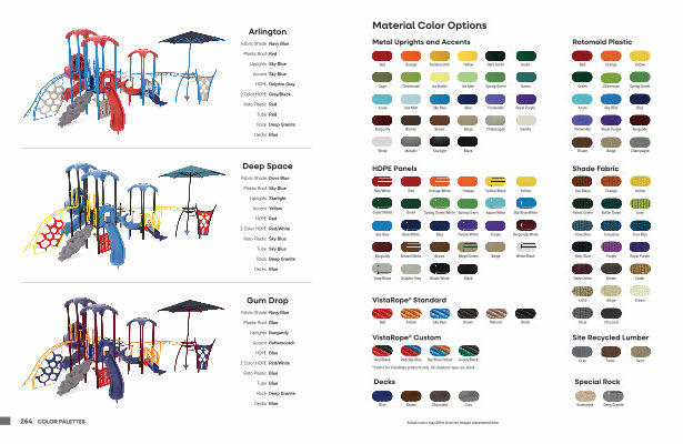 Actual colors may differ from the images represented here . Metal Uprights and Accents Rotomold Plastic Shade Fabric HDPE Panels Azure / White Purple / White Purple Beige / Green Beige Red / White Red Black / White Black Sky Blue / White Sky Blue Brown / White Brown Spring Green / White Spring Green Burgundy / White Burgundy White / Black Gray / Black Dolphin Gray Yellow / Black Yellow Green / White Green Orange / White Orange Blue / White Blue Red Red Ocean Champagne Sage Royal Purple Green Periwinkle Black Yellow Butterscotch Sea Mist White Ice Butter Bronze Green Yellow Sky Blue Metallic Ice Mint Brown Dark Green Blue Starlight Burgundy Blue Periwinkle Royal Purple Spring Green Beige Orange Orange Azure Vanilla Beige Champagne Brown Azure Spring Green Chartreuse Sky Blue Chartreuse Burgundy Charcoal Silver Forest Green Dove Blue Bottle Green Lime Navy Blue True Blue Purple Cream Beige Latte Cedar Brown Turquoise Royal Purple Deep Ochre Sun Blaze Orange Yellow Decks Blue Chocolate Gray Brown Special Rock Deep Granite Sandstone Site Recycled Lumber Gray Tudor Sand VistaRope ® Standard Brown Natural Sky Blue Yellow Red Black VistaRope ® Custom Red / Black Sky Blue / Yellow Green / Black Red / Sky Blue * Colors for VistaRope products only . All standard ropes are black . Material Color Options