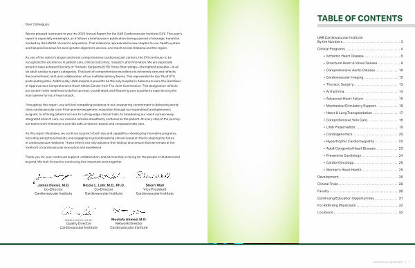 We are pleased to present to you the 2025 Annual Report for the UAB Cardiovascular Institute( CVI). This year’ s report is especially meaningful, as it follows a brief pause in publication during a period of strategic transition marked by the UAB St. Vincent’ s acquisition. That milestone represented a new chapter for our health system and has positioned us for even greater alignment, access, and reach across Alabama and the region.