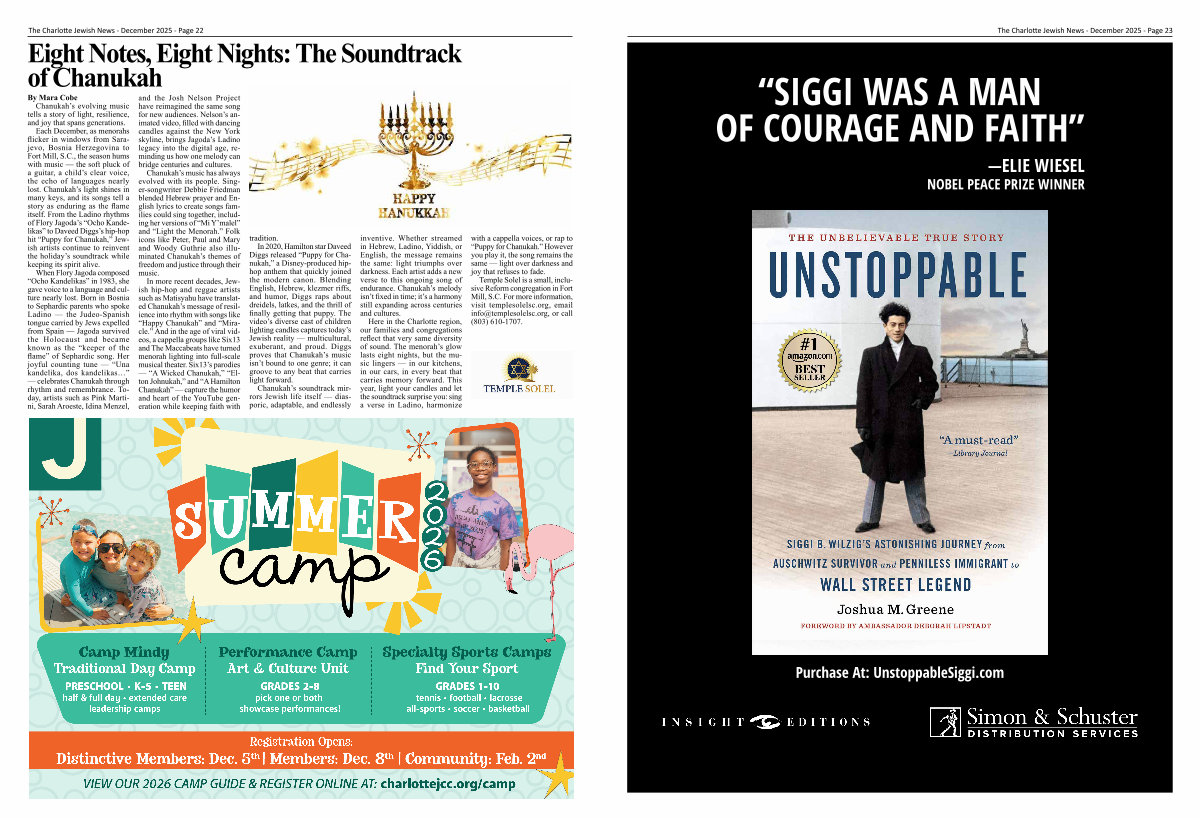 Here in the Charlotte region, our families and congregations reflect that very same diversity of sound. The menorah’ s glow lasts eight nights, but the music lingers— in our kitchens, in our cars, in every beat that carries memory forward. This year, light your candles and let the soundtrack surprise you: sing a verse in Ladino, harmonize with a cappella voices, or rap to“ Puppy for Chanukah.” However you play it, the song remains the same— light over darkness and joy that refuses to fade.