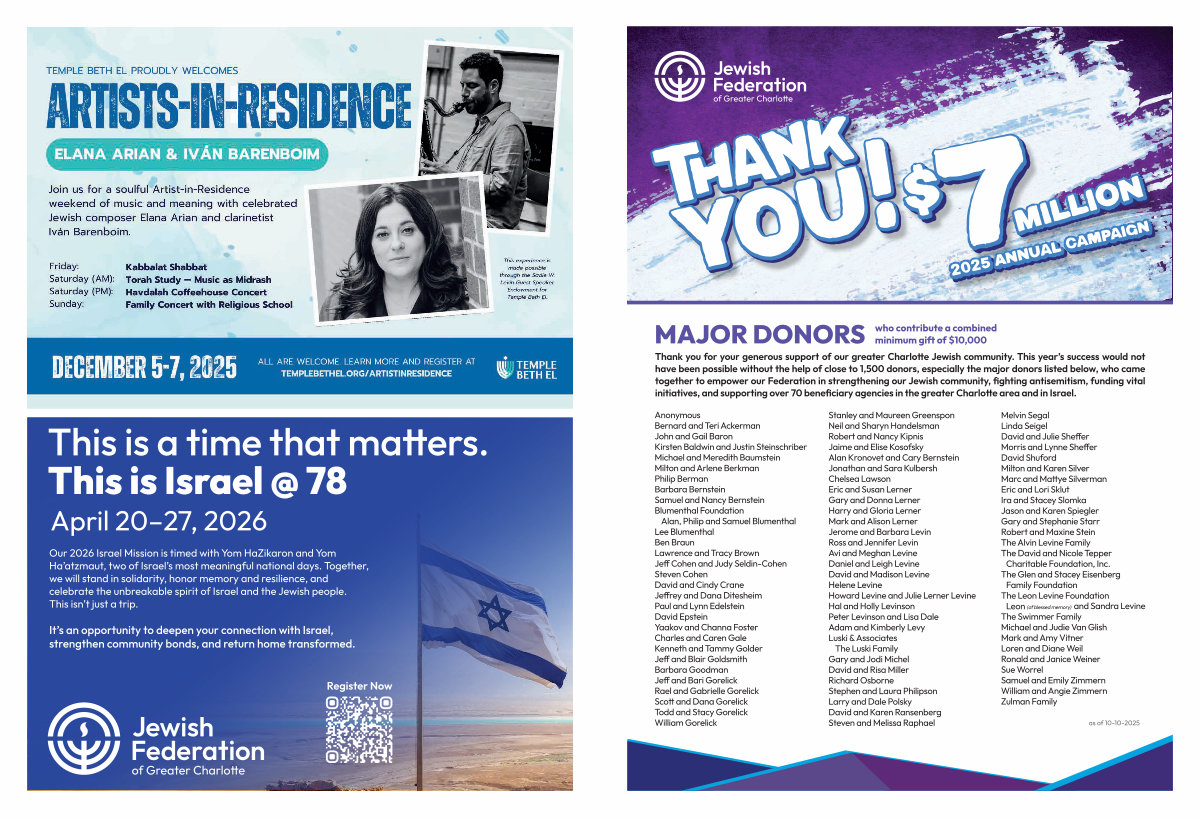 Thank you for your generous support of our greater Charlotte Jewish community. This year’ s success would not have been possible without the help of close to 1,500 donors, especially the major donors listed below, who came together to empower our Federation in strengthening our Jewish community, fighting antisemitism, funding vital initiatives, and supporting over 70 beneficiary agencies in the greater Charlotte area and in Israel.