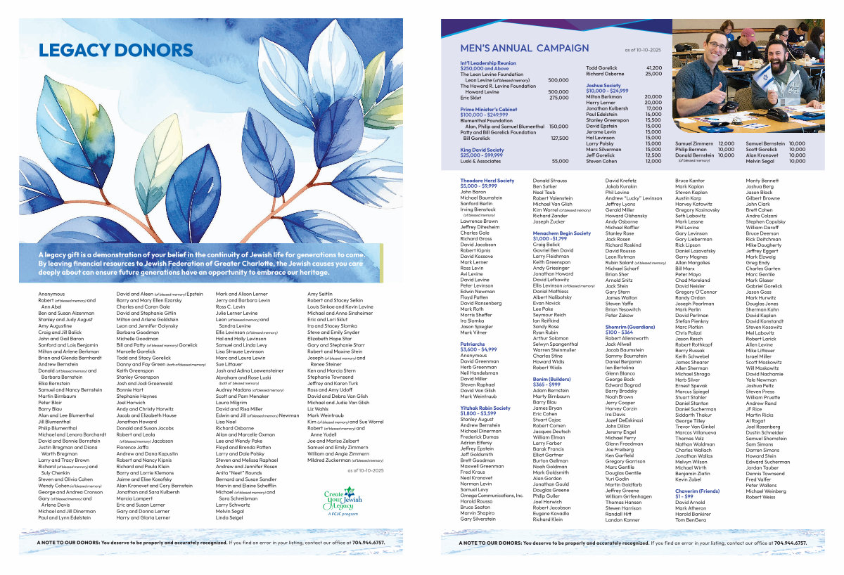 Ann Abel Ben and Susan Aizenman Stanley and Judy August Amy Augustine Craig and Jill Balick John and Gail Baron Sanford and Lois Benjamin Milton and Arlene Berkman Brian and Glenda Bernhardt Andrew Bernstein Donald( of blessed memory) and Barbara Bernstein Elka Bernstein Samuel and Nancy Bernstein Martin Birnbaum Peter Blair Barry Blau Alan and Lee Blumenthal Jill Blumenthal Philip Blumenthal Michael and Lenora Borchardt David and Bonnie Bornstein Justin Bregman and Diana Warth Bregman Larry and Tracy Brown Richard( of blessed memory) and Suly Chenkin Steven and Olivia Cohen Wendy Cohen( of blessed memory) George and Andrea Cronson Gary( of blessed memory) and Arlene Davis Michael and Jill Dinerman Paul and Lynn Edelstein