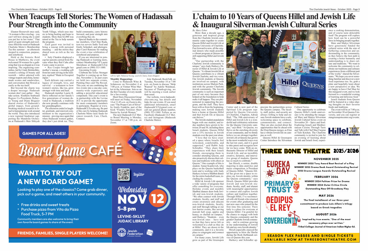 If you are interested in joining Hadassah or learning more, contact Membership VP Laurie Sheinhaus at HadassahCLT @ gmail. com or( 980) 553-1880. Upcoming Events Celebrate the TaTas: Stronger Together is coming up on Sunday, November 2. In past years we held two separate events, Painting Days and The Reveal. This year, we are combining the two events into a one-day community-wide experience and adding a powerful educational component. This year’ s event is in partnership with the Levine JCC to provide the opportunity for more community members to participate. Register at www. HadassahCLTevents. org. Be part of the cure by helping Hadassah Charlotte Metro raise funds for cancer research. Care. Check. Connect.