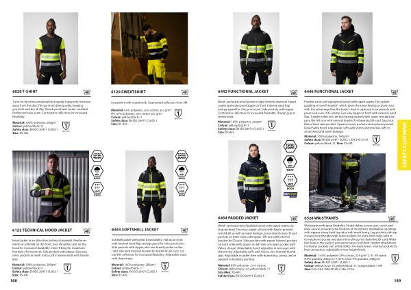 Material : 1 : 65 % polyester 35 % cotton , 235 g / m 2 2 : 91.5 % nylon 8.5 % spandex , 245g / m 2 3 : 91 % nylon 9 % spandex , 248g / m 2 Safety class : EN ISO 20471 CLASS 1 Colour : yellow / navy-10 , yellow / black-11 , orange / black-1799 Size : C44 – C62 , D84 – D120 , C146 – C156