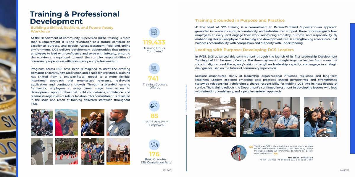 Programs across DCS have been reimagined to meet the evolving demands of community supervision and a modern workforce. Training has shifted from a one-size-fits-all model to a more flexible, intentional approach that emphasizes relevance, real-world application, and continuous growth. Through a blended learning framework, employees at every career stage have access to development opportunities that build competence, confidence, and readiness— regardless of role or location. This commitment is reflected in the scale and reach of training delivered statewide throughout FY25.