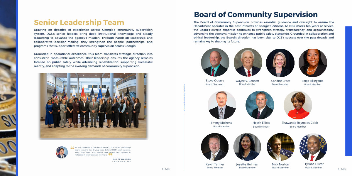 Drawing on decades of experience across Georgia’ s community supervision system, DCS’ s senior leaders bring deep institutional knowledge and steady leadership to advance the agency’ s mission. Through hands-on leadership and collaborative decision-making, they strengthen the people, partnerships, and programs that support effective community supervision across Georgia.