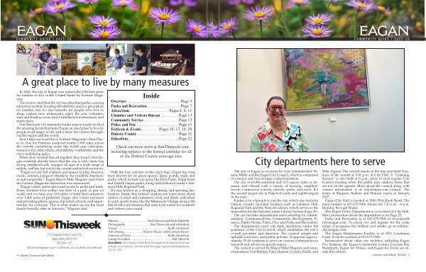 Information about other city facilities, including Eagan Fire Stations, the Eagan Community Center, Cascade Bay Waterpark, Eagan Art House, and Eagan Ice Arena are inside this edition.