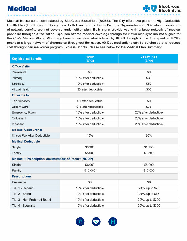 Medical Insurance is administered by BlueCross BlueShield( BCBS). The City offers two plans- a High Deductible Health Plan( HDHP) and a Copay Plan. Both Plans are Exclusive Provider Organizations( EPO), which means outof-network benefits are not covered under either plan. Both plans provide you with a large network of medical providers throughout the nation. Spouses offered medical coverage through their own employer are not eligible for the City ' s Medical Plans. Pharmacy benefits are also administered by BCBS through Prime Therapeutics. BCBS provides a large network of pharmacies throughout the nation. 90-Day medications can be purchased at a reduced cost through their mail-order program Express Scripts. Please see below for the Medical Plan Summary: