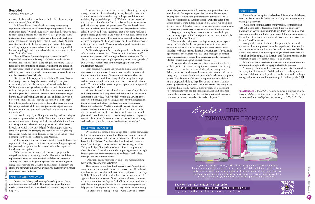 “ If we are doing a remodel, we encourage them to go through storage rooms and offices, throwing out anything that may have accumulated over the years that they no longer need( furniture, shelving, displays, old signage, etc.). With the equipment out of the way, our staff outfits our floor scrubber with a more aggressive pad and cleaning agents and gets to work! This can breathe new life into an older rubber floor that has‘ lost’ the purple and yellow color,” Schively said.“ Any equipment that is not being replaced is given a thorough inspection and repaired by our maintenance staff during this time as well. If TVs need to be replaced on the truss or we need to upgrade Wi-Fi or portions of our POS, that also occurs while the club is closed. We want to make a good impression on our members when we re-open.”