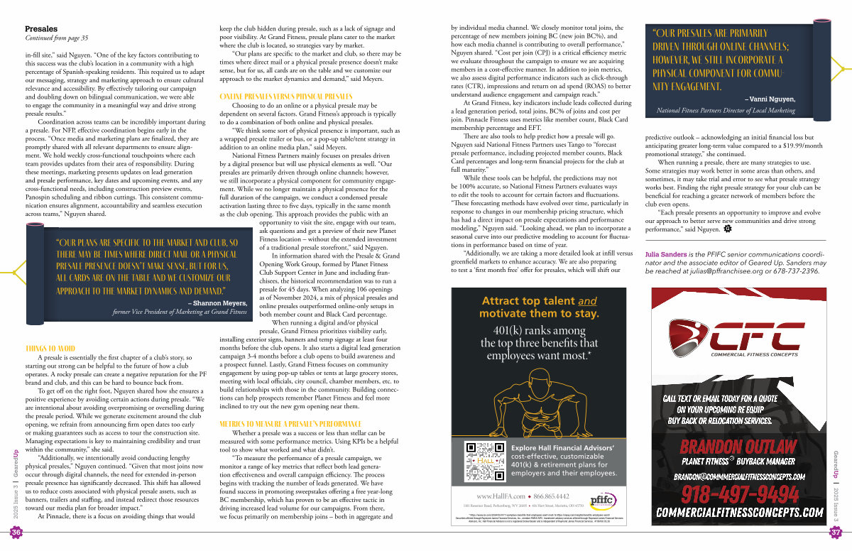 At Pinnacle, there is a focus on avoiding things that would keep the club hidden during presale, such as a lack of signage and poor visibility. At Grand Fitness, presale plans cater to the market where the club is located, so strategies vary by market.