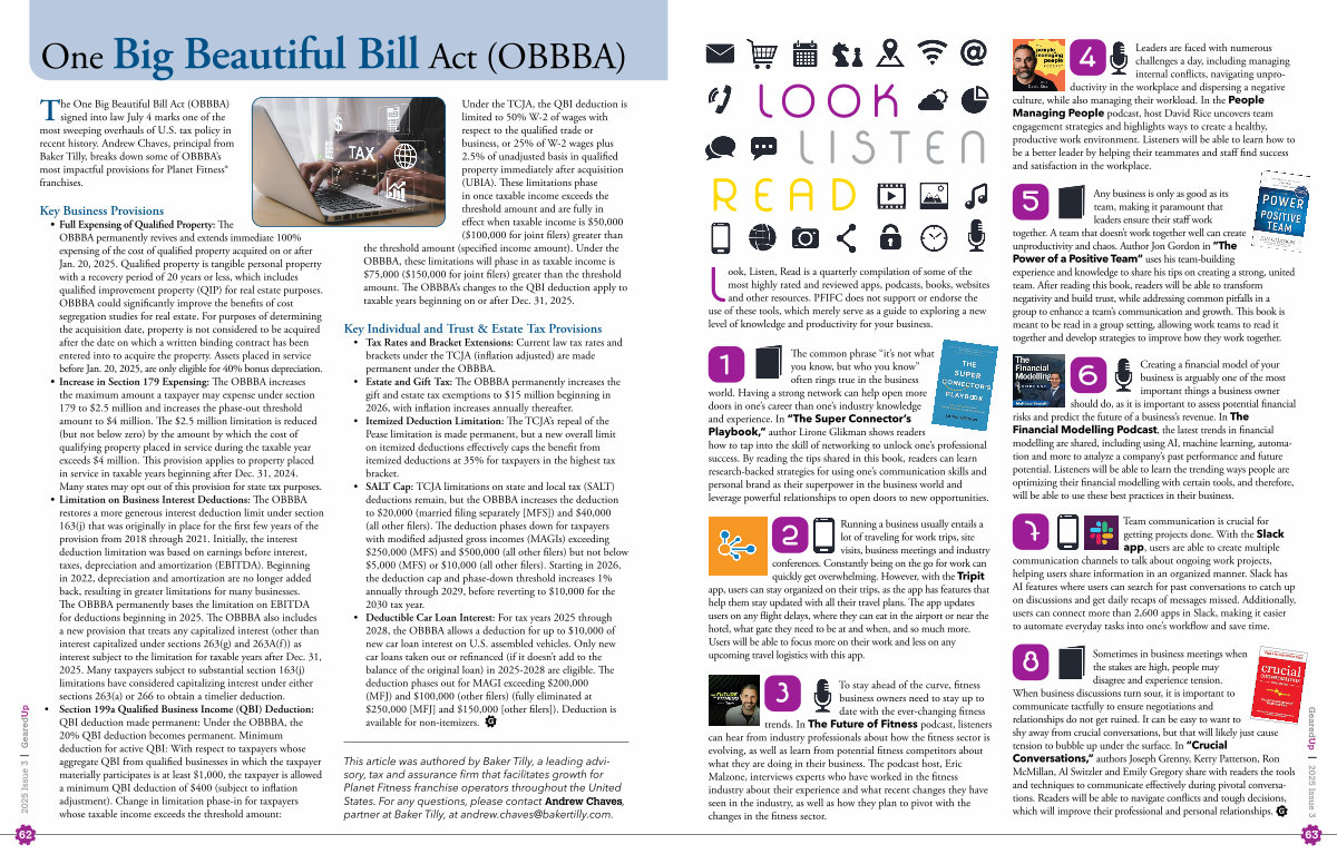 The One Big Beautiful Bill Act( OBBBA) signed into law July 4 marks one of the most sweeping overhauls of U. S. tax policy in recent history. Andrew Chaves, principal from Baker Tilly, breaks down some of OBBBA’ s most impactful provisions for Planet Fitness ® franchises.
