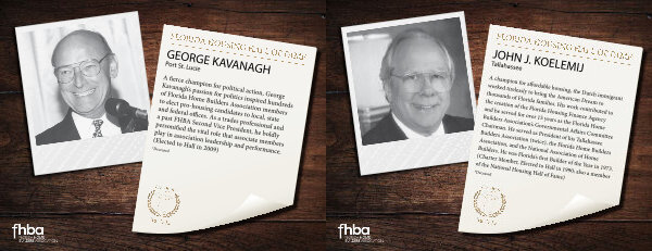 President and Builder of the Year of the Florida Home Builders Association in 1989, he has been a visionary industry leader since he started in the home building business in 1953. He served 22 years on the Board of Directors of Pasco County Builders Association and as its President in 1976. He balanced Association leadership with significant contributions to government relations, community activities and charitable causes.( Elected to Hall in 1998)