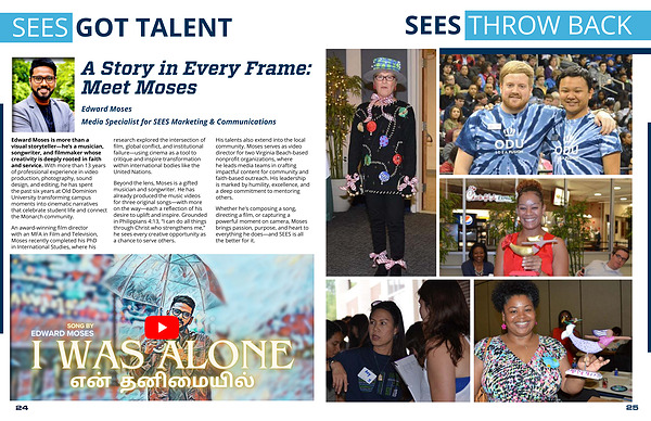Edward Moses is more than a visual storyteller— he’ s a musician, songwriter, and filmmaker whose creativity is deeply rooted in faith and service. With more than 13 years of professional experience in video production, photography, sound design, and editing, he has spent the past six years at Old Dominion University transforming campus moments into cinematic narratives that celebrate student life and connect the Monarch community.