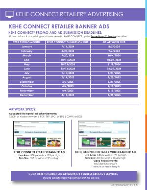 2025 PROMO MONTH : KEHE CONNECT SUBMISSION DUE : AD ARTWORK DUE : January 7 / 19 / 2024 8 / 2 / 2024 February 8 / 23 / 2024 9 / 6 / 2024 March 9 / 20 / 2024 10 / 4 / 2024 April 10 / 11 / 2024 10 / 25 / 2024 May 10 / 25 / 2024 11 / 8 / 2024 June 12 / 13 / 2024 12 / 27 / 2024 July 1 / 10 / 2025 1 / 24 / 2025 August 2 / 14 / 2025 2 / 28 / 2025 September 3 / 7 / 2025 3 / 21 / 2025 October 4 / 4 / 2025 4 / 18 / 2025 November 4 / 4 / 2025 4 / 18 / 2025 December 4 / 11 / 2025 4 / 25 / 2025