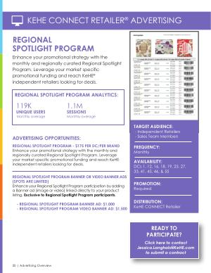 Enhance your promotional strategy with the monthly and regionally curated Regional Spotlight Program . Leverage your market specific promotional funding and reach KeHE ® independent retailers looking for deals .