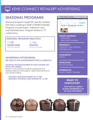 Seasonal programs target DC specific holidays with direct ordering in KeHE CONNECT Retailer . Programs include Easter , Valentine ’ s Day , and Fall / Halloween . Program limited to “ S ” coded items .