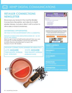 RETAILER CONNECTIONS NEWSLETTER BANNER AD - $ 2,100 ( SPOTS ARE LIMITED ) Want to get in front of KeHE retail partners ? Now you can through our monthly Retailer Connections Newsletter . Include a Banner advertisement to reach the inboxes of over 13K retailers .