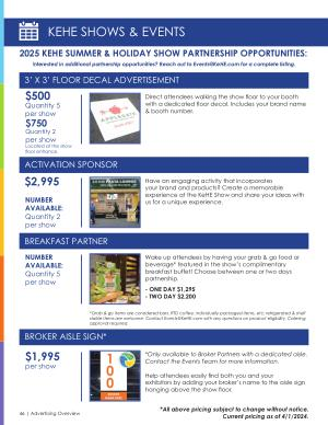 2025 KEHE SUMMER & HOLIDAY SHOW PARTNERSHIP OPPORTUNITIES : Interested in additional partnership opportunities ? Reach out to Events @ KeHE . com for a complete listing .