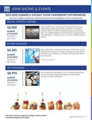 2025 KEHE SUMMER & HOLIDAY SHOW PARTNERSHIP OPPORTUNITIES : Interested in additional partnership opportunities ? Reach out to Events @ KeHE . com for a complete listing .