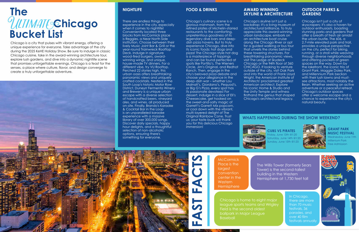 Chicago isn ' t just a city of skyscrapers; it ' s also a haven for outdoor enthusiasts, boasting stunning parks and gardens that offer a breath of fresh air amidst the urban bustle. The 606, a 2.7-mile elevated park and trail, provides a unique perspective on the city, perfect for biking, running, or a stroll while weaving through diverse neighborhoods and offering pockets of green spaces on the way. Down by the lakefront, the iconic trio of Grant Park, Maggie Daley Park, and Millennium Park beckon with their lush lawns and mustsee attractions, most notably the Bean. Whether seeking an active adventure or a peaceful retreat, Chicago ' s outdoor spaces offer a welcome escape and a chance to experience the city ' s natural beauty.