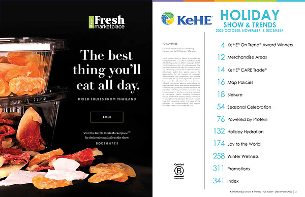 KeHE Holiday Show & Trends is published by KeHE Distributors, LLC 1245 E. Diehl Road, Suite 200-300 Naperville, IL 60563. Copyright © 2025 KeHE Distributors, LLC. All rights reserved. The publisher reserves the right to accept or reject any advertising, promotional or editorial material. Advertisers, and / or their agents, assume the responsibility for all content of published advertisements and promotions; and assume responsibility for any claims against the publisher based on the advertisement or promotion. Editorial contributors assume responsibility for their published works and assume responsibility for any claims against the publisher based on the published work. No part of this publication may be reproduced in any form or by any electronic or mechanical means, including information storage and retrieval systems, without permission in writing from the publisher. Editorial content may not necessarily reflect the views of the publisher. All correspondence and inquires should be addressed to Ads @ KeHE. com.