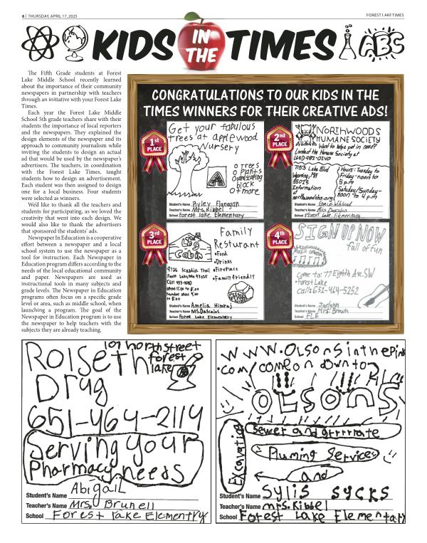 Each year the Forest Lake Middle School 5th grade teachers share with their students the importance of local reporters and the newspapers. They explained the design elements of the newspaper and its approach to community journalism while inviting the students to design an actual ad that would be used by the newspaper’ s advertisers. The teachers, in coordination with the Forest Lake Times, taught students how to design an advertisement. Each student was then assigned to design one for a local business. Four students were selected as winners.