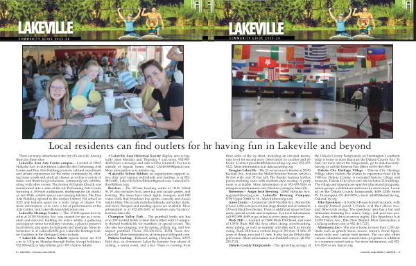 Lakeville Area Arts Center campus— Located at 20965 Holyoke Ave. in downtown Lakeville, the Performing Arts Center and Fine Arts Building promote cultural enrichment and artistic experiences for the entire community by offering many youth and adult art classes, as well as a variety of music and theatrical productions, community art, exhibits, along with other events. The former All Saints Church was transformed into a state-of-the-art Performing Arts Center featuring a 300-seat auditorium, multipurpose art studio, an Art Walk, exhibit spaces and catering kitchen. The Fine Arts Building opened in the former District 194 school in 2023 and features space for a wide range of classes. For more information, or to view a list of performances at the Arts Center, visit LakevilleAreaArtsCenter. com.