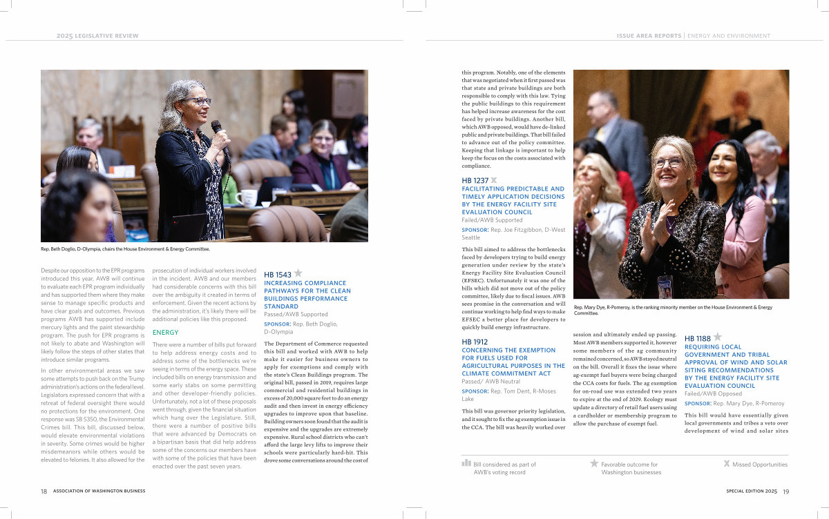 The Department of Commerce requested this bill and worked with AWB to help make it easier for business owners to apply for exemptions and comply with the state’ s Clean Buildings program. The original bill, passed in 2019, requires large commercial and residential buildings in excess of 20,000 square feet to do an energy audit and then invest in energy efficiency upgrades to improve upon that baseline. Building owners soon found that the audit is expensive and the upgrades are extremely expensive. Rural school districts who can’ t afford the large levy lifts to improve their schools were particularly hard-hit. This drove some conversations around the cost of