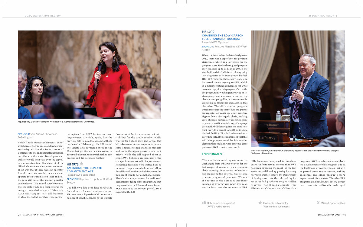 The environmental space remains unchanged from what we’ ve seen for the last couple of years, with a discussion about reducing the exposure to chemicals and managing the externalities related to certain types of products. We saw the return of the extended producer responsibility programs again this year, and in fact, saw the number of EPR bills increase compared to previous years. Unfortunately, the one that AWB has been opposing the most for the last seven years did end up passing by a very narrow margin. It directs the Department of Ecology to create the rule making for an extended producer responsibility program that shares elements from Minnesota, Colorado and California’ s programs. AWB remains concerned about the development of this program due to the likelihood of cost increases that will be passed down to consumers, making groceries and other products more expensive within the state. The other EPR programs did not advance, but we expect to see them return. Given the make-up of