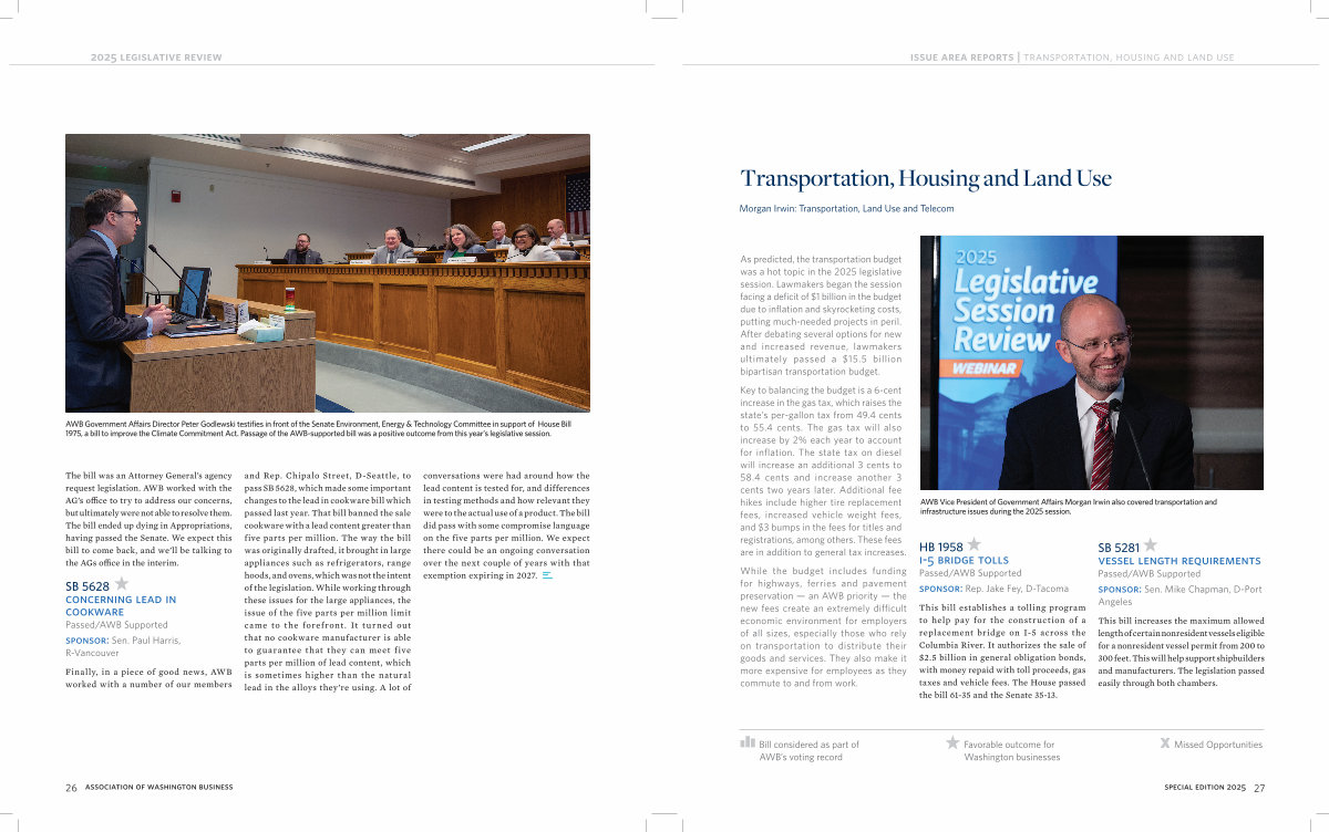 Finally, in a piece of good news, AWB worked with a number of our members and Rep. Chipalo Street, D-Seattle, to pass SB 5628, which made some important changes to the lead in cookware bill which passed last year. That bill banned the sale cookware with a lead content greater than five parts per million. The way the bill was originally drafted, it brought in large appliances such as refrigerators, range hoods, and ovens, which was not the intent of the legislation. While working through these issues for the large appliances, the issue of the five parts per million limit came to the forefront. It turned out that no cookware manufacturer is able to guarantee that they can meet five parts per million of lead content, which is sometimes higher than the natural lead in the alloys they’ re using. A lot of conversations were had around how the lead content is tested for, and differences in testing methods and how relevant they were to the actual use of a product. The bill did pass with some compromise language on the five parts per million. We expect there could be an ongoing conversation over the next couple of years with that exemption expiring in 2027.