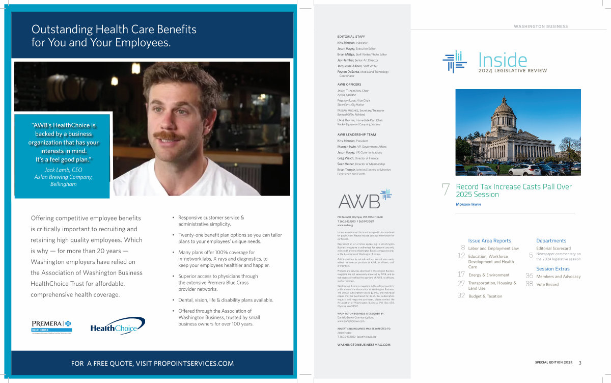 Products and services advertised in Washington Business magazine are not necessarily endorsed by AWB, and do not necessarily reflect the opinions of AWB, its officers, staff or members.