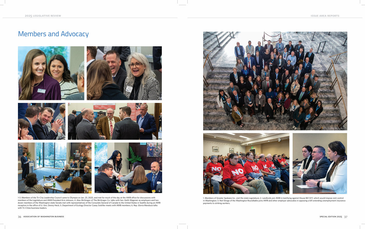 1. Members of Greater Spokane Inc. visit the state Legislature; 2. Landlords join AWB in testifying against House Bill 1217, which would impose rent control in Washington; 3. Neil Strege of the Washington Roundtable joins AWB and other employer advocates in opposing a bill extending unemployment insurance payments to striking workers. special edition 2025 37