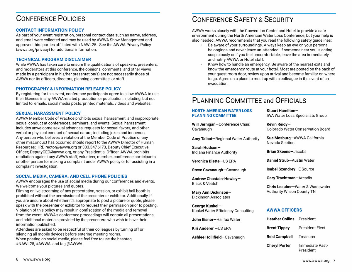 AWWA works closely with the Convention Center and Hotel to provide a safe environment during the North American Water Loss Conference, but your help is also needed. AWWA recommends that you read the following safety guidelines: