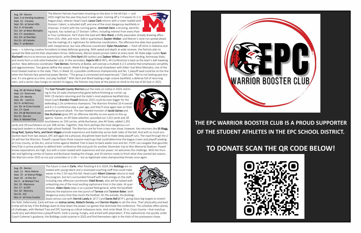yards and 18 touchdowns on just 108 carries. Together, they form perhaps the most dangerous running back tandem in Arkansas high school football. The Warriors are far from a two-man show, however. Key returners like Eli Blagg, Doug Reel, Quincy Perry, and Devin Magee provide experience and leadership across both sides of the ball. And with so much production back from last season, EPC will again be a physical, disciplined team built to make deep playoff runs. The road through the 2- 2A will test the Warriors. Powell’ s squad faces three massive matchups that could determine the league crown and playoff seeding: at Cross County, at Des Arc, and at home against Marked Tree in back-to-back weeks nine and ten. If EPC can navigate that gauntlet, they’ ll be in prime position to defend their conference title and push for another December trip to War Memorial Stadium. Powell knows expectations are high, but with a roster loaded with experience and star power, he welcomes the challenge. With the thunder-and-lightning combo of Gaines and Buchanan leading the charge, and 19 starters ready to finish what they started last season, the Warriors enter 2025 as not just contenders in 2-2A— but as legitimate state championship threats once again.